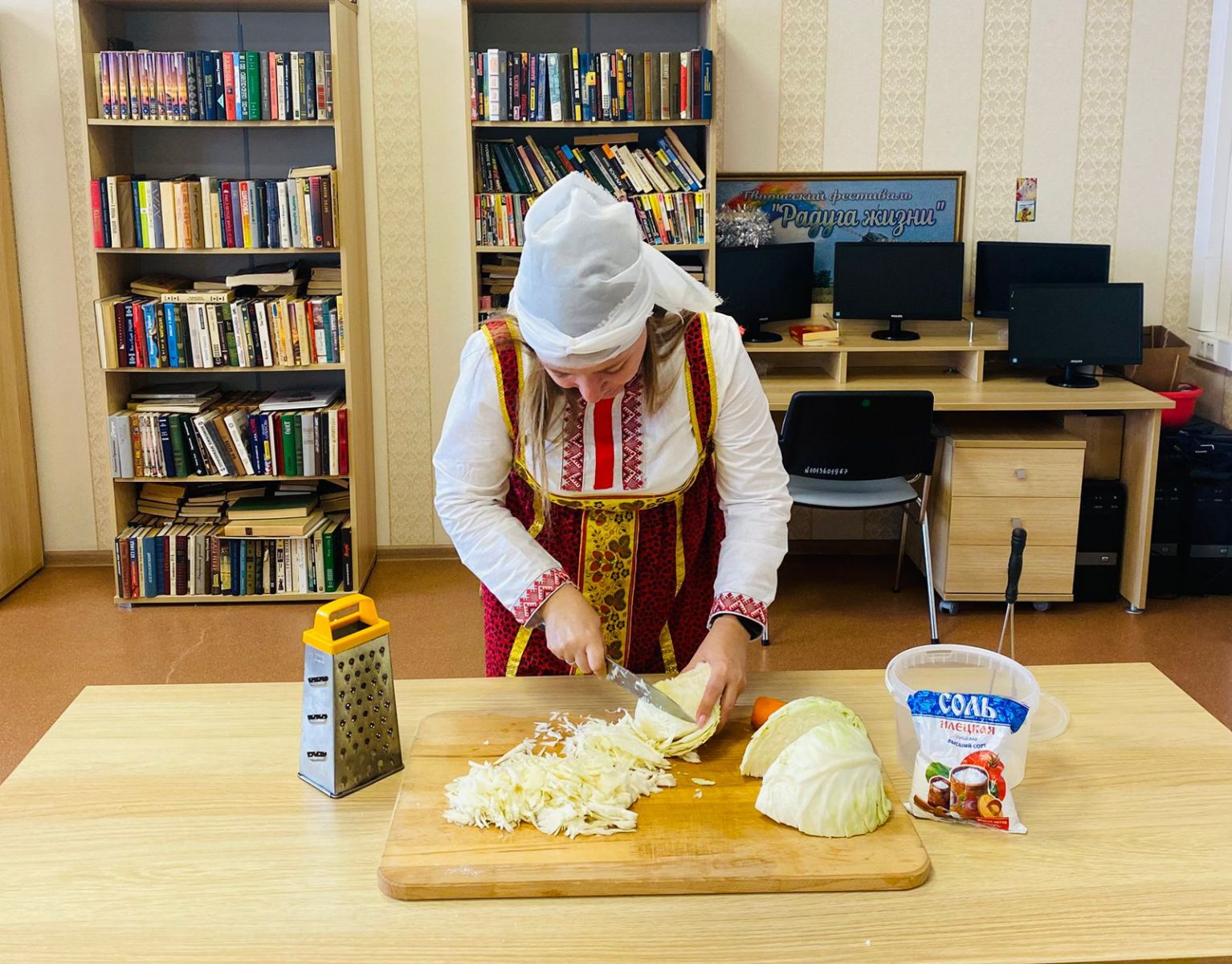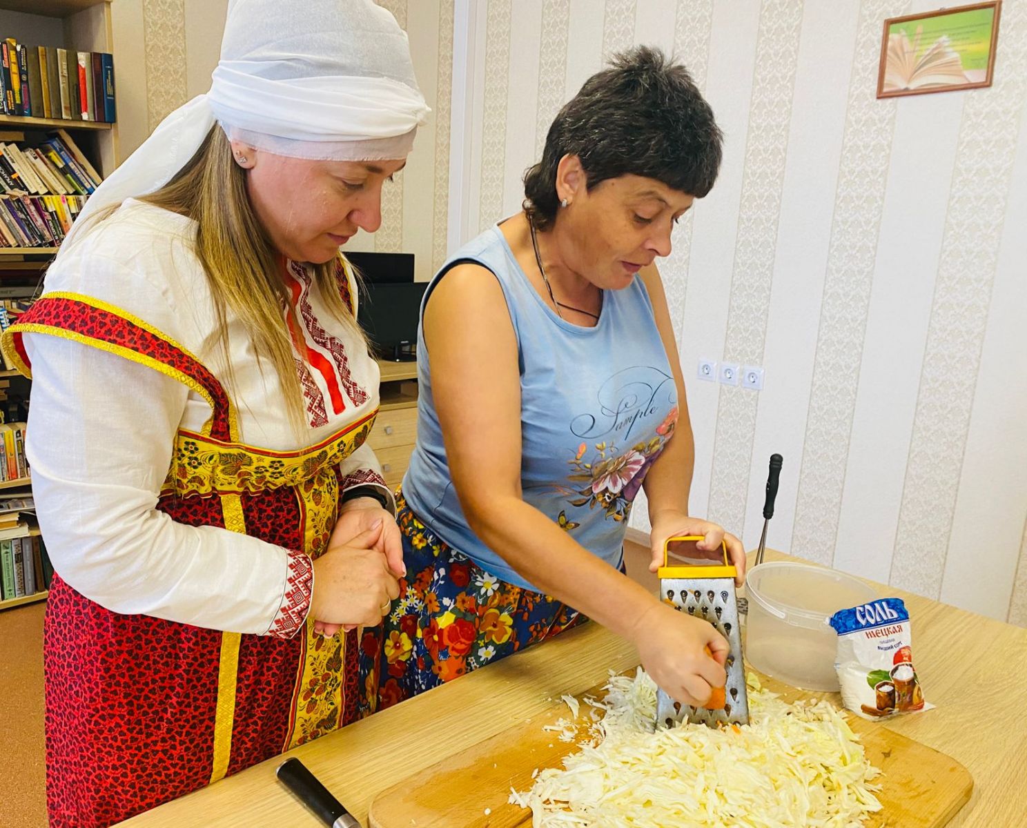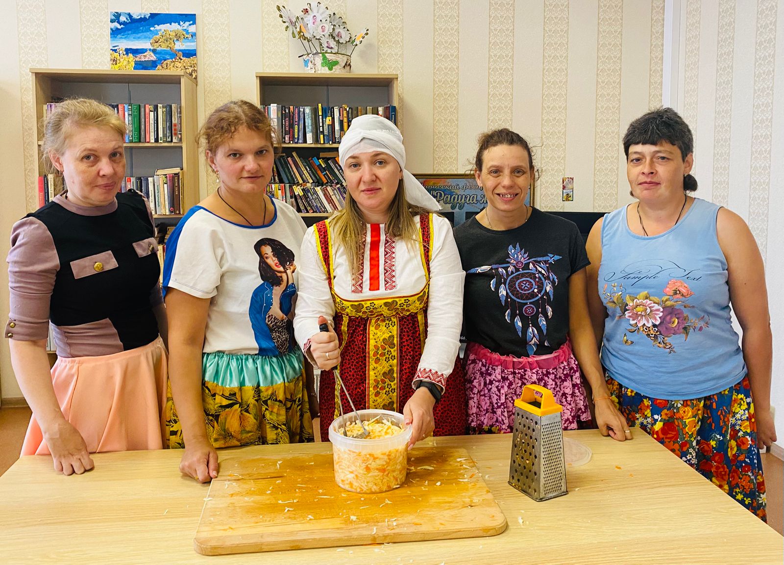 Нарядно одетые участницы взяли ножи и тёрки, чтобы нашинковать капусту, натереть морковь и уложить всё в ведёрки. Всё сделано своими руками!
